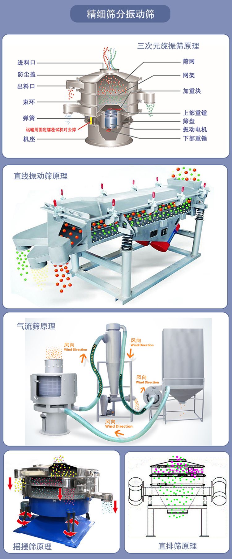 直排篩的原理是通過振動(dòng)源的作用使物料在篩面做三維運(yùn)動(dòng),這種運(yùn)動(dòng)方式可以使結(jié)塊物料散開,快速的通過篩網(wǎng)。精細(xì)物料直接由下部排出,雜物粗料則通過排渣出料口排出。