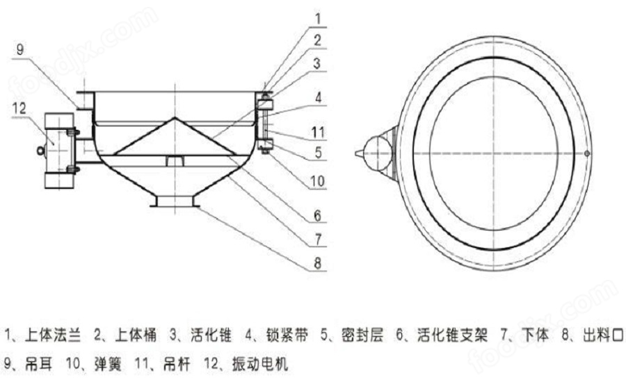 將振動(dòng)由機(jī)接通由源攝動(dòng)由機(jī)起振。且產(chǎn)生的激振力使給料斗下體在水平方向產(chǎn)生強(qiáng)列的振動(dòng)此振動(dòng)通過錐面或球面活化器將水平激振力分解為法向力和切向力法向力呈放射狀傳遞到物料深處切向力使物料受剪從而消除倉內(nèi)物料的起拱使物料像流水一樣從出料口排出。切斷電源振動(dòng)電機(jī)停振排料可停止。