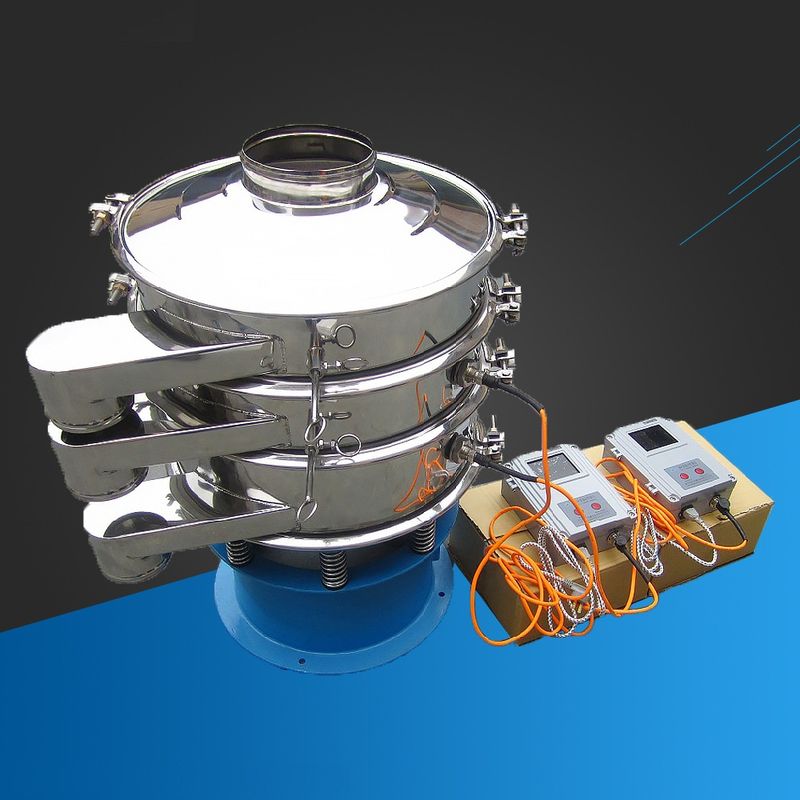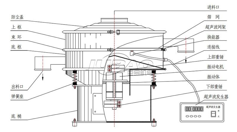 超聲波振動(dòng)篩是將220V、50Hz或110V、60Hz電能轉(zhuǎn)化為36KHz的高頻電能,輸入超聲換能器,將其變成36KHz機(jī)械振動(dòng),產(chǎn)生的功率超聲波使篩網(wǎng)作高頻振動(dòng)。篩網(wǎng)上的物料在作低頻旋振運(yùn)動(dòng)的同時(shí),疊加上超聲振動(dòng),既可防止網(wǎng)孔堵塞,又可使篩分機(jī)提高產(chǎn)量和質(zhì)量,從而達(dá)到快速篩分和清網(wǎng)的目的,使超微細(xì)粉篩分成為易事。該系統(tǒng)在傳統(tǒng)的振動(dòng)篩基礎(chǔ)上在篩網(wǎng)上引入一個(gè)低振幅、高頻率的超聲振動(dòng)波(機(jī)械波),以改變超微細(xì)分體的篩分性能。特別適合高附加值精細(xì)分體的用戶使用。