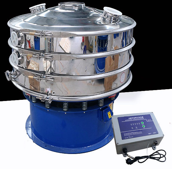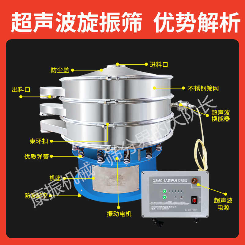 超聲波振動(dòng)篩是將220V、50Hz或110V、60Hz電能轉(zhuǎn)化為36KHz的高頻電能,輸入超聲換能器,將其變成36KHz機(jī)械振動(dòng),產(chǎn)生的功率超聲波使篩網(wǎng)作高頻振動(dòng)。篩網(wǎng)上的物料在作低頻旋振運(yùn)動(dòng)的同時(shí),疊加上超聲振動(dòng),既可防止網(wǎng)孔堵塞,又可使篩分機(jī)提高產(chǎn)量和質(zhì)量,從而達(dá)到快速篩分和清網(wǎng)的目的,使超微細(xì)粉篩分成為易事。該系統(tǒng)在傳統(tǒng)的振動(dòng)篩基礎(chǔ)上在篩網(wǎng)上引入一個(gè)低振幅、高頻率的超聲振動(dòng)波(機(jī)械波),以改變超微細(xì)分體的篩分性能。特別適合高附加值精細(xì)分體的用戶(hù)使用。
