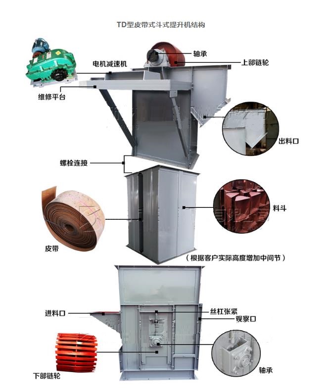 TD型斗式提升機(jī)由運(yùn)行部分(料斗與牽引膠帶),帶有傳動滾筒的上部區(qū)段、帶有拉緊滾筒的下部區(qū)段、中間機(jī)殼、驅(qū)動裝置、逆止制動裝置等組成。適用于向上輸送松散密度ρ<1.5t/m3粉狀、粒狀和小塊狀的無磨琢性和半磨琢性散狀物料,如煤、砂、焦末、水泥、碎礦石等。另一種鋼絲繩芯膠帶斗式提升機(jī),由于它的牽引構(gòu)件為鋼絲繩芯膠帶所以比TD型的橡膠帶具有更好的耐磨抗拉效果。