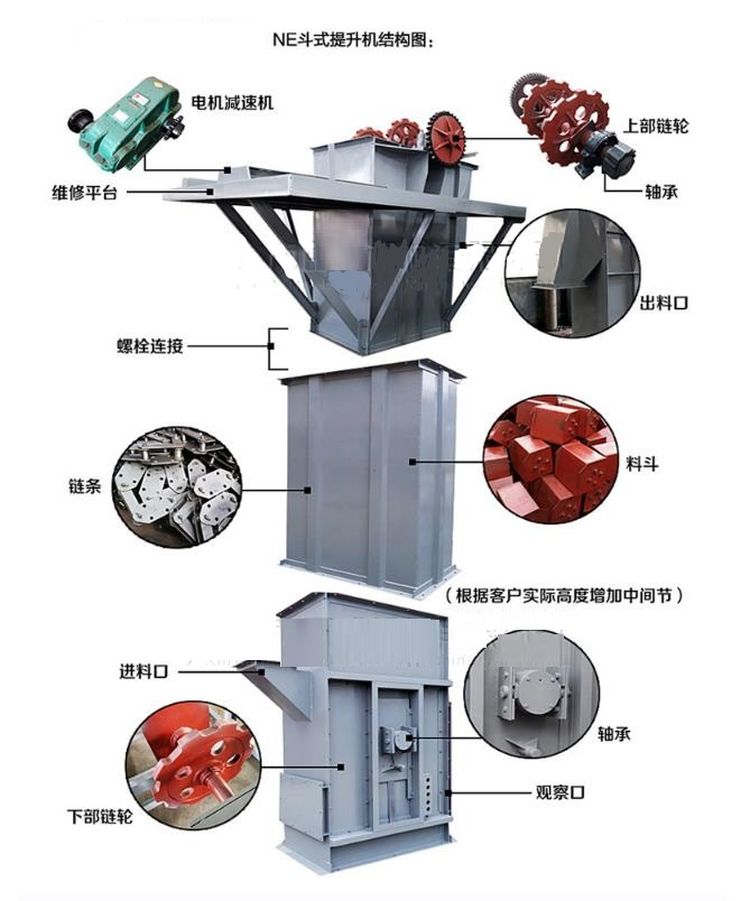 NE系列板鏈斗式提升機(jī)由運(yùn)行部件、驅(qū)動裝置、上部裝置、中部機(jī)殼、下部裝置組成。