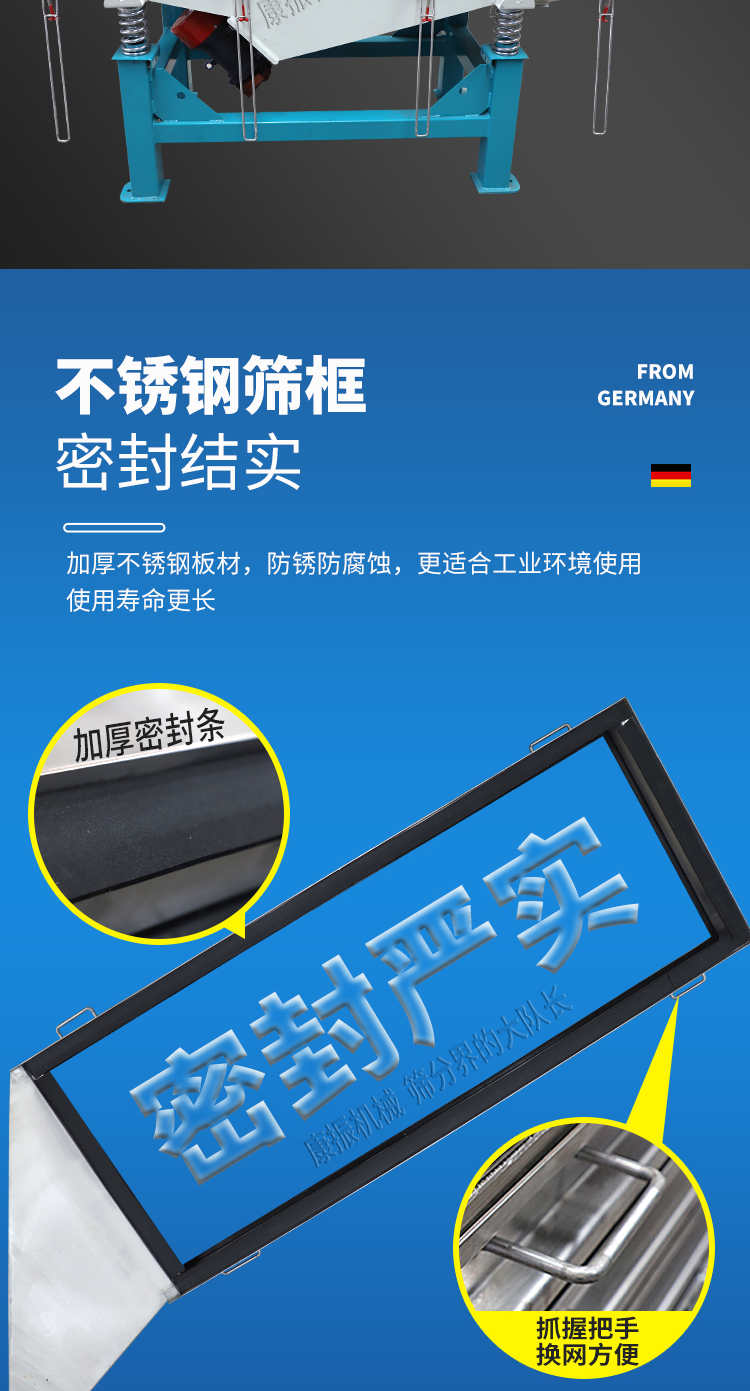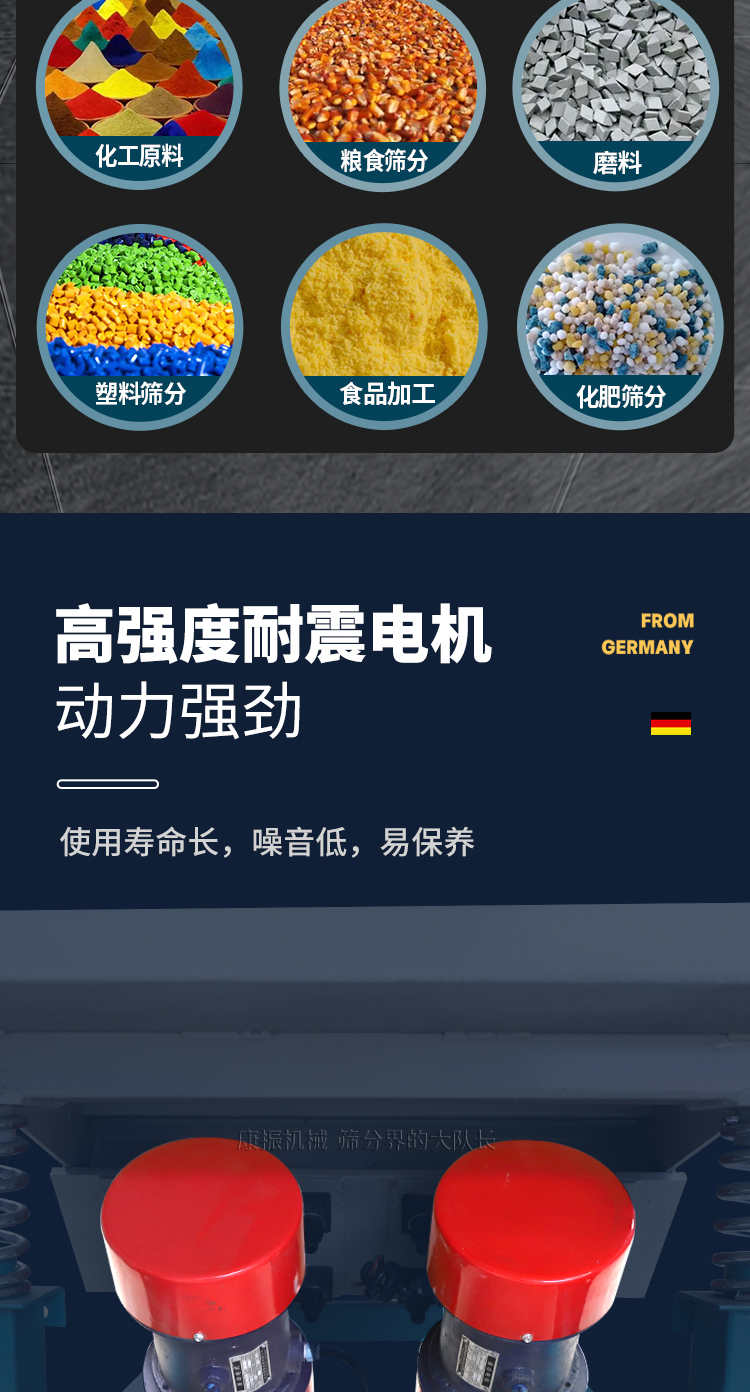 對(duì)粉狀、顆粒狀物料的篩選和分級(jí),廣泛應(yīng)用于塑料、磨料、化工、醫(yī)藥、建材、糧食、炭素、化肥等行業(yè).直線振動(dòng)篩(直線篩)系新型的篩分設(shè)備,廣泛用于礦山、煤炭、冶煉、建材、耐火材料、輕工、化工等行業(yè)。