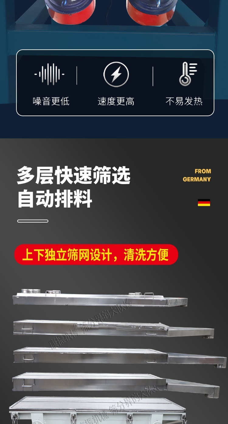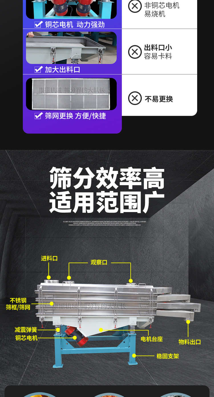 是以利用振動(dòng)電機(jī)激振作為振動(dòng)源,使物料在篩網(wǎng)上被拋起,同時(shí)受力向前做直線規(guī)則運(yùn)動(dòng),物料從給料機(jī)均勻地進(jìn)入篩分機(jī)的進(jìn)料口,通過(guò)多層篩網(wǎng)產(chǎn)生數(shù)種規(guī)格的篩上物、篩下物、從各自的出口排出。具有耗能低、產(chǎn)量高、結(jié)構(gòu)簡(jiǎn)單、易維修、全封閉結(jié)構(gòu),無(wú)粉塵溢散,自動(dòng)排料, 更適合于高產(chǎn)能流水線作業(yè)。