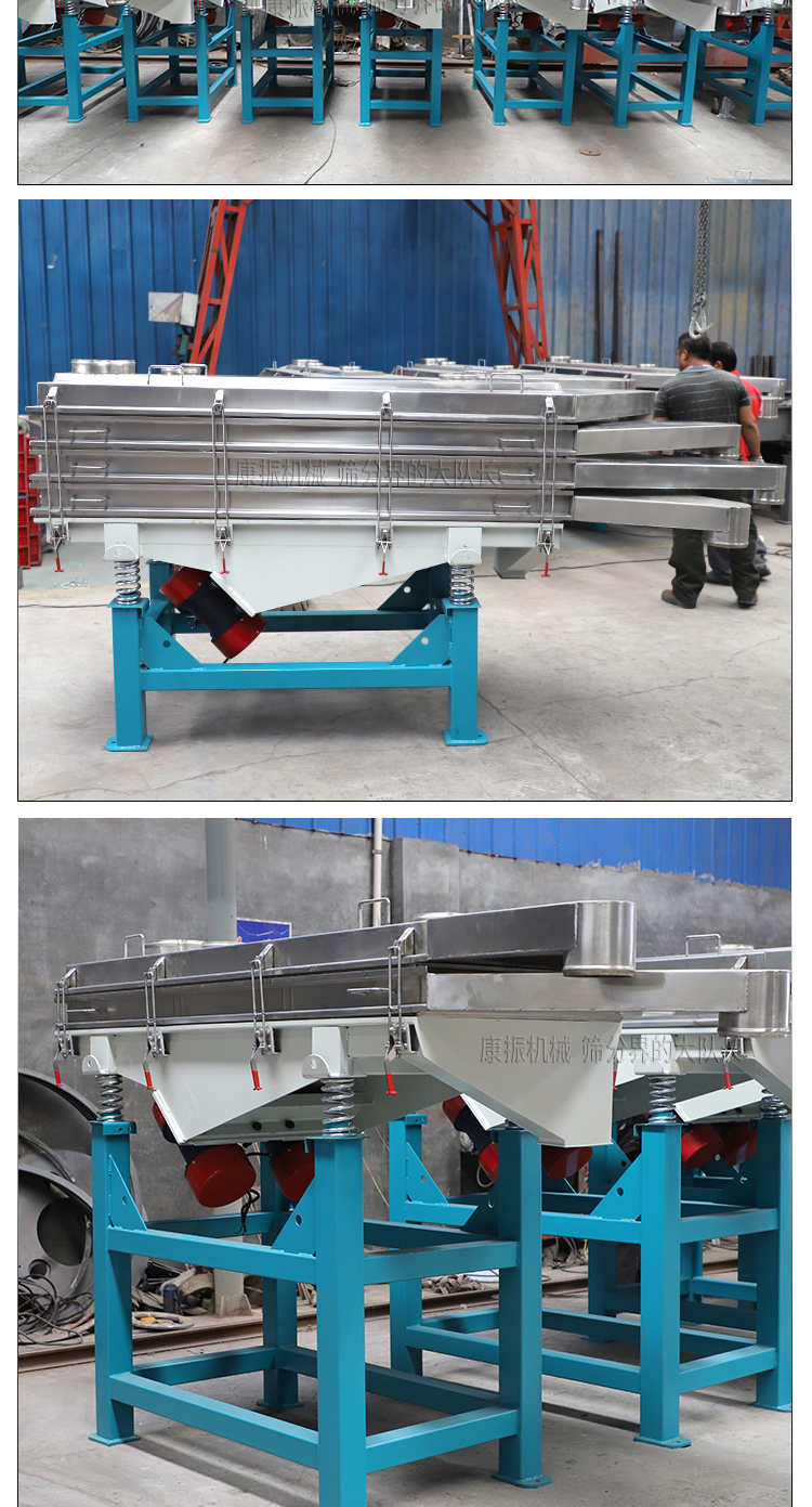 直線振動(dòng)篩利用振動(dòng)電機(jī)激振作為振動(dòng)源,使物料在篩網(wǎng)上被拋起,同時(shí)向前作直線運(yùn)動(dòng),物料從給料機(jī)均勻地進(jìn)入篩分機(jī)的進(jìn)料口,通過(guò)多層篩網(wǎng)產(chǎn)生數(shù)種規(guī)格的篩上物、篩下物、分別從各自的出口排出。具有耗能低、產(chǎn)量高、結(jié)構(gòu)簡(jiǎn)單、易維修、全封閉結(jié)構(gòu),無(wú)粉塵溢散,自動(dòng)排料,更適合于流水線作業(yè)。