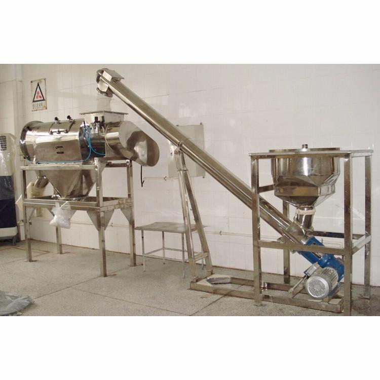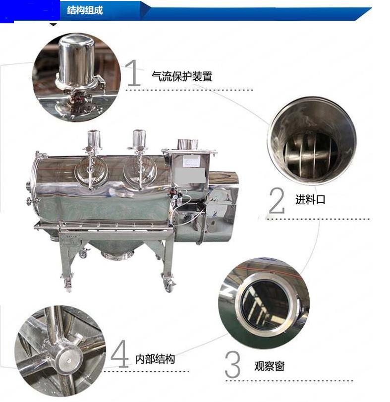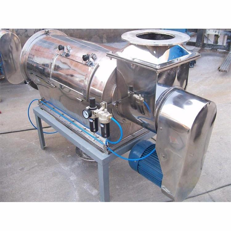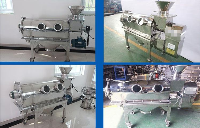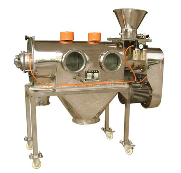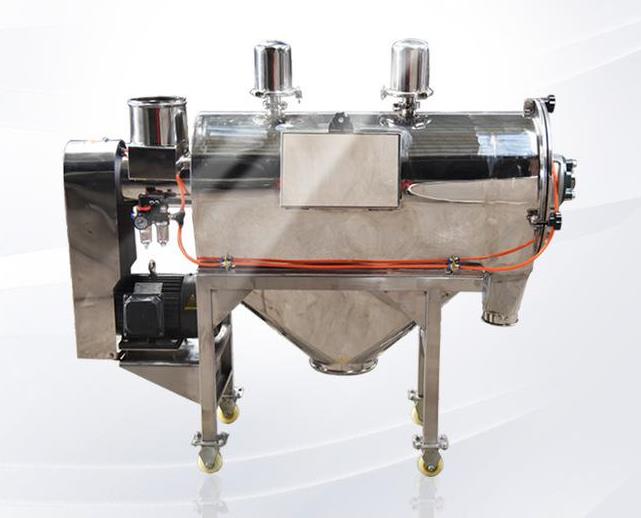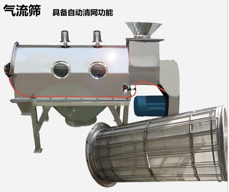 臥式氣流篩篩網(wǎng)為圓筒狀,置于機(jī)體內(nèi),物料通過螺旋輸送系統(tǒng)后,和氣流混合、霧化進(jìn)入網(wǎng)筒內(nèi);