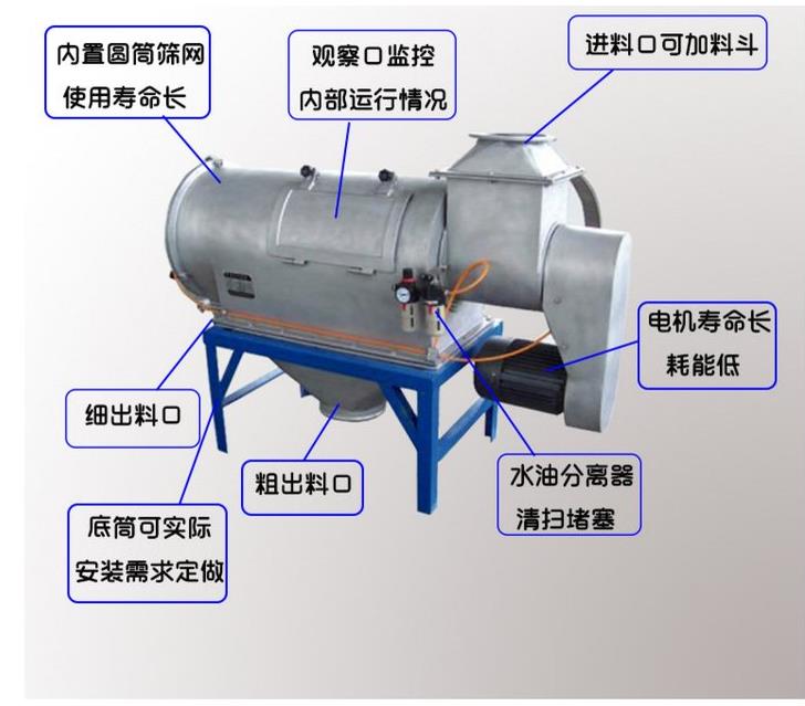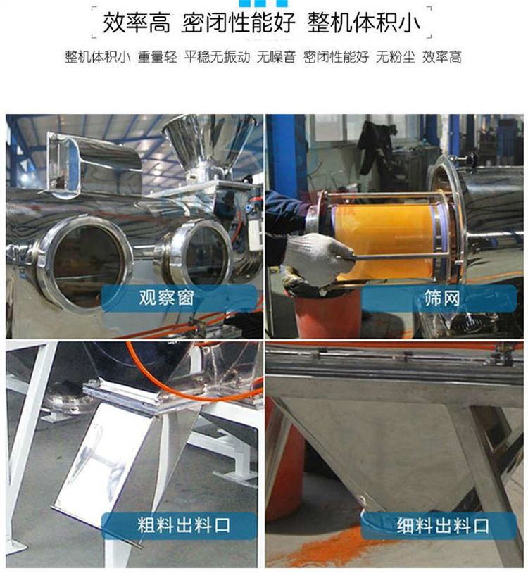 不能過網(wǎng)的物料沿筒壁從粗料排出口排出,達(dá)到快速分離的目的。