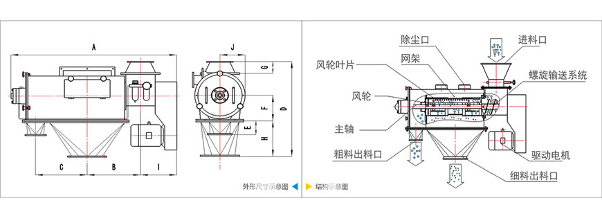 通過網(wǎng)筒內(nèi)風(fēng)輪葉片使物料同時(shí)受離心力和旋風(fēng)推進(jìn)力,從而迫使物料噴射過網(wǎng),由細(xì)料排出口排出,不能過網(wǎng)的物料沿網(wǎng)筒壁從粗料排出口排出。