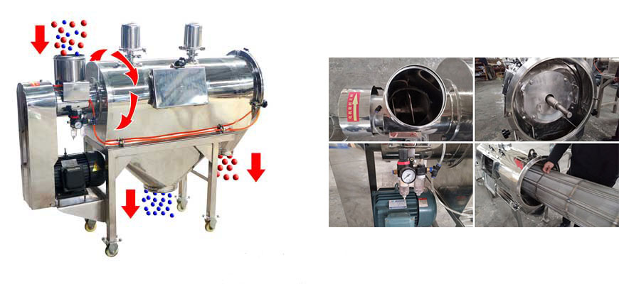 本設(shè)備篩網(wǎng)為圓筒狀,置于機(jī)體內(nèi),物料通過螺旋輸送系統(tǒng)后與氣流混合、霧化進(jìn)入網(wǎng)筒內(nèi),