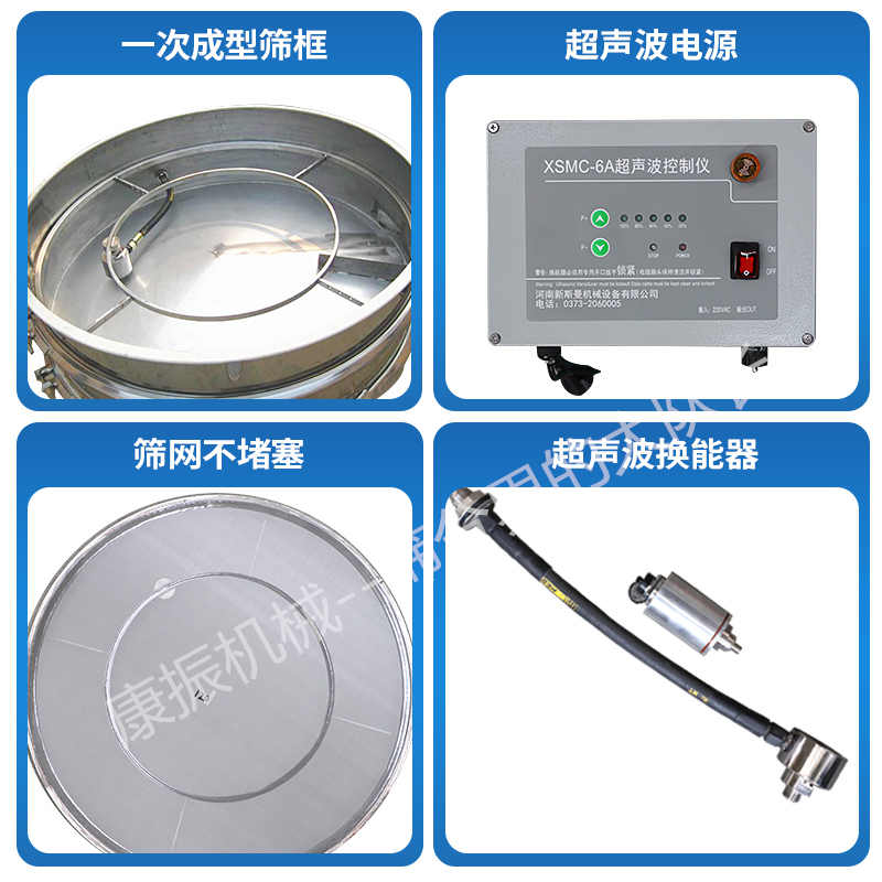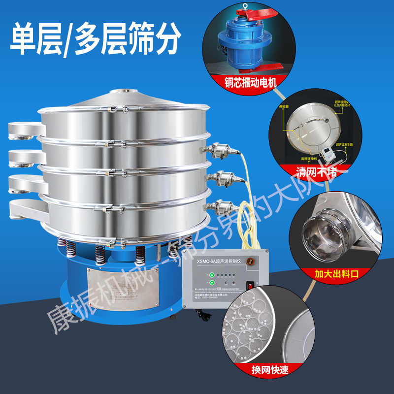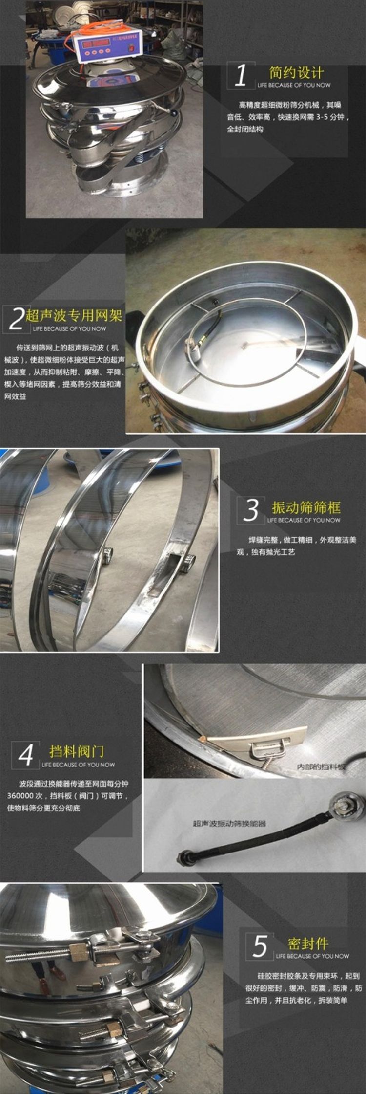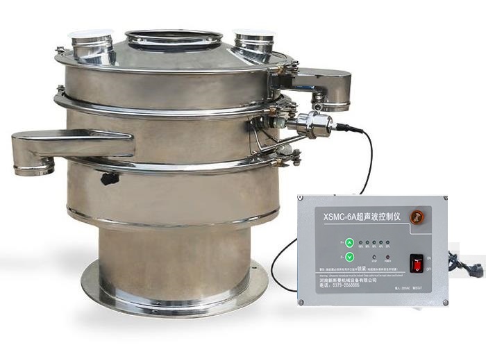 超聲波振動篩是將220V、50Hz或110V、60Hz電能轉(zhuǎn)化為36KHz的高頻電能,輸入超聲換能器,將其變成36KHz機(jī)械振動,產(chǎn)生的功率超聲波使篩網(wǎng)作高頻振動。篩網(wǎng)上的物料在作低頻旋振運動的同時,疊加上超聲振動,既可防止網(wǎng)孔堵塞,又可使篩分機(jī)提高產(chǎn)量和質(zhì)量,從而達(dá)到快速篩分和清網(wǎng)的目的,使超微細(xì)粉篩分成為易事。該系統(tǒng)在傳統(tǒng)的振動篩基礎(chǔ)上在篩網(wǎng)上引入一個低振幅、高頻率的超聲振動波(機(jī)械波),以改變超微細(xì)分體的篩分性能。特別適合高附加值精細(xì)分體的用戶使用。