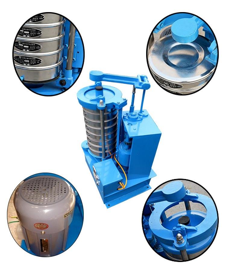 電機(jī)帶動(dòng)齒輪通過同步帶傳動(dòng)到主軸上,經(jīng)齒輪變速后主軸按要求的轉(zhuǎn)速轉(zhuǎn)動(dòng),主軸帶動(dòng)偏心輪使滑板做往復(fù)運(yùn)動(dòng),帶動(dòng)安裝在滑板托盤中的試驗(yàn)篩左右搖動(dòng),同時(shí)主軸帶動(dòng)頂桿齒輪轉(zhuǎn)動(dòng),變速后頂桿齒輪通過凸輪頂擊頂桿,頂桿使拍錘上下拍擊試驗(yàn)篩上蓋,使得試驗(yàn)篩、分樣篩中的物料往復(fù)和上下振動(dòng),使小于試驗(yàn)篩的篩面網(wǎng)孔的物料顆粒篩分進(jìn)下層試驗(yàn)篩,如此層層篩選,使每層試驗(yàn)篩內(nèi)只留相同粒度的物料。達(dá)到不同粒度的分離并確定此物料的粒度組成。